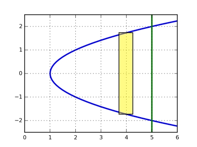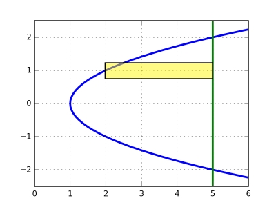 Exemple 2. On veut calculer l'aire de la région située entre la parabole $x = y^2 + 1$ et la droite $x = 5$. On peut considérer qu'il s'agit de l'aire entre les courbes $y = -\sqrt{x-1}$ et $y = \sqrt{x-1}$ pour $x$ entre $1$ et $5$.