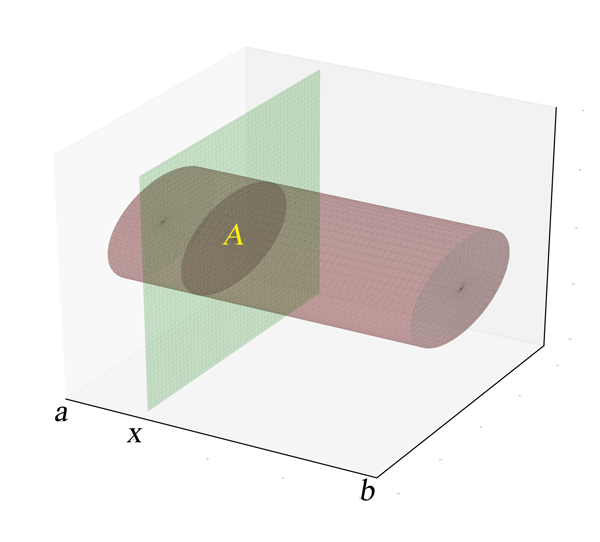 Supposons qu'on veuille calculer le volume d'un solide, comme par exemple l'ellipsoïde dans la figure 1 à gauche. Une manière de faire consiste à imaginer un axe des $x$ situé le long du solide et à balayer le solide avec un plan qui se déplace perpendiculairement à l'axe. La situation est illustrée dans la figure 2 : on voit que la valeur $x$ où le plan coupe l'axe varie entre deux valeurs extrêmes $a$ et $b$; on désignera par $A(x)$ l'aire de la section du solide par le plan.
