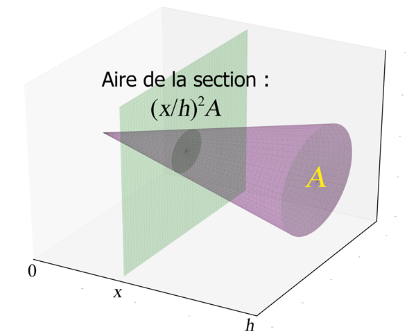 $x/h$. Il s'ensuit que si l'aire de la base est $A$, l'aire des sections sera $(x/h)^2A$. On aura donc
