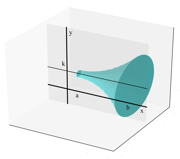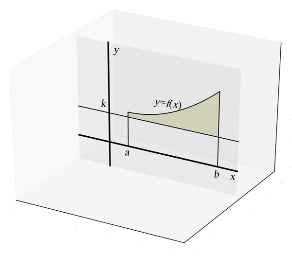 Exemple 3. Dans la figure 6, on a en beige une région du plan $xy$ délimitée par la courbe $y=f(x)$ et les droites $x=a$, $x=b$ et $y=k$. Si on fait tourner cette région autour de la droite $y=k$, on obtient le solide de révolution représenté à la figure 7. Dans ce cas les sections seront des disques de rayon $r = |f(x)-k|$ et donc d'aire $A(x) = \pi r^2 = \pi [f(x)-k]^2$. On aura donc