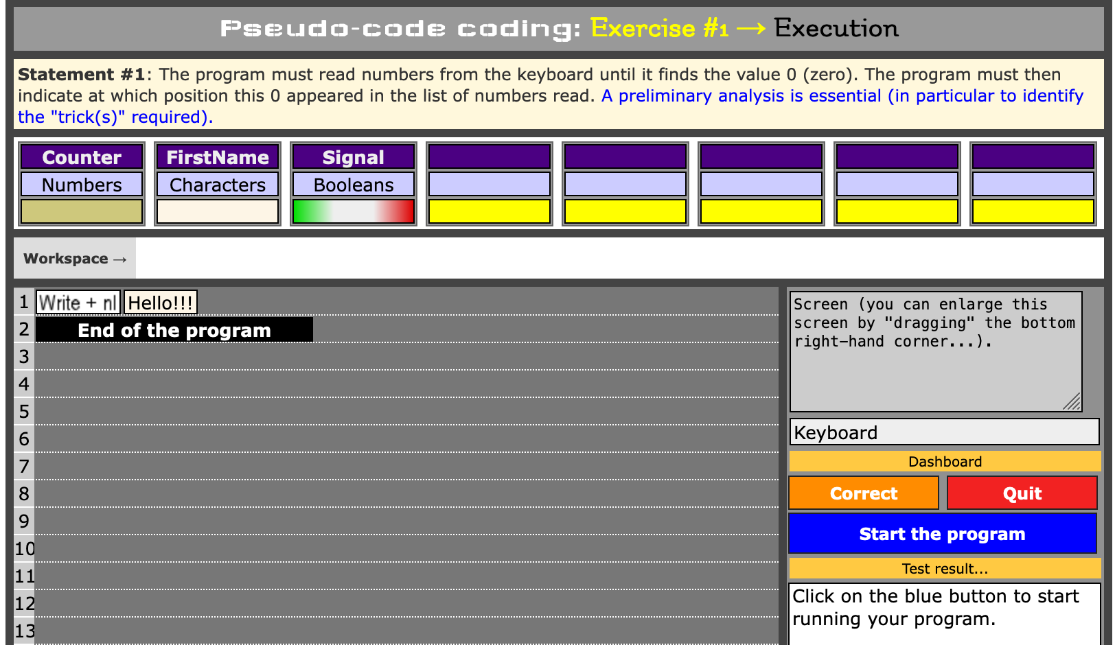 Allows you to exit the exercise and return to the menu... Please note that your entire program is deleted when you do this, and can no longer be recovered. If you want to keep a "souvenir" for your archives, you can make a screen copy before quitting. |