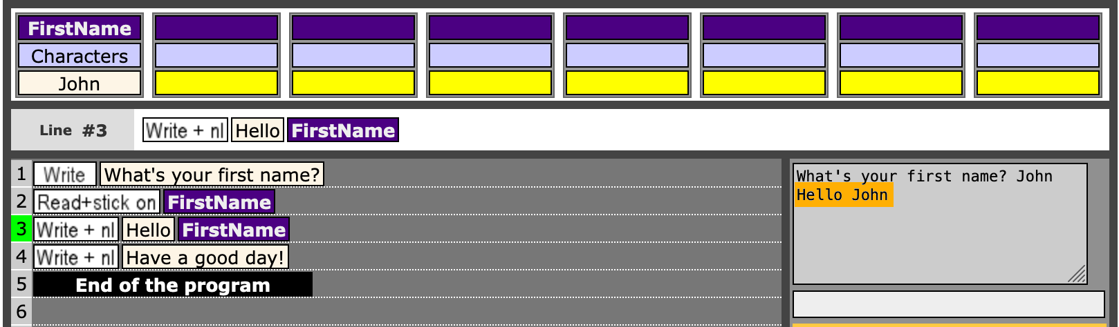 For example, in the image above, line 3 has just been processed. You can see that the request is to display "Hello" FirstName. If you look at the screen, where the display took place, you'll see, as shown by the orange frame, that the computer displayed "Hello John". In the workspace, the computer has therefore replaced the variable name with its content before displaying it.