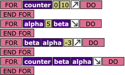 Here are a few examples of FOR loops that have been set up correctly, provided the values are numerical and each variable already contains a numerical value.