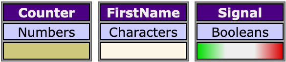 - The third line contains the contents of the variable. To make it easier to distinguish between the three types, numbers have a khaki background, strings have a beige background and Booleans have a background made of green and red, symbolizing the two concepts True and False.
