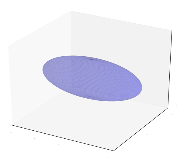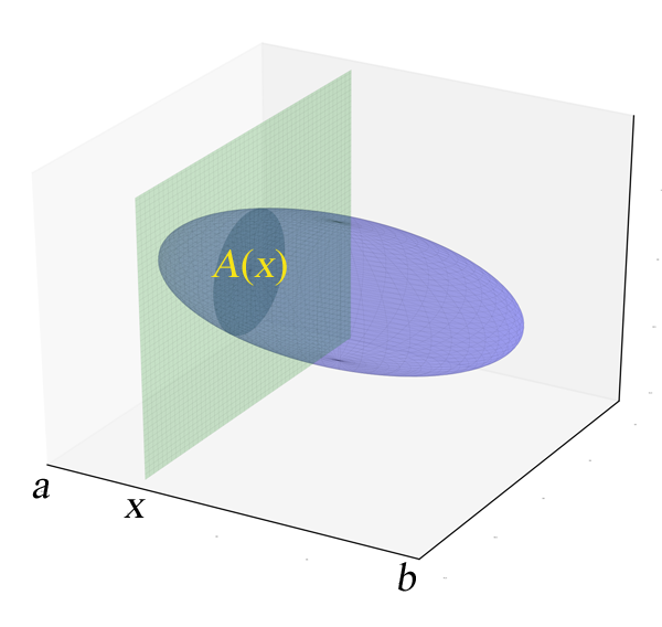 Supposons qu'on veuille calculer le volume d'un solide, comme par exemple l'ellipsoïde dans la figure 1 à gauche. Une manière de faire consiste à imaginer un axe des $x$ situé le long du solide et à balayer le solide avec un plan qui se déplace perpendiculairement à l'axe. La situation est illustrée dans la figure 2 : on voit que la valeur $x$ où le plan coupe l'axe varie entre deux valeurs extrêmes $a$ et $b$; on désignera par $A(x)$ l'aire de la section du solide par le plan.