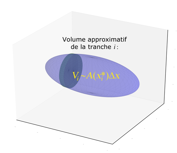 Les plans qui croisent l'axe aux valeurs $ x_i$ découpent le solide en un nombre $n$ de tranches ou rondelles qui ont des faces parallèles et une épaisseur $\Delta x$. Si on désigne le volume de chacune de ces rondelles par $V_i$, le volume du solide sera