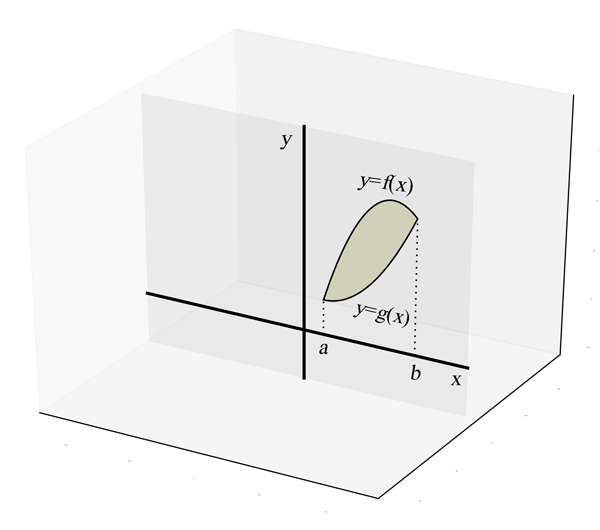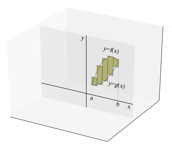 où $r(x)$ est la distance entre $x$ et l'axe de rotation et $h(x)$ est la hauteur de la région qu'on fait tourner pour la valeur $x$.