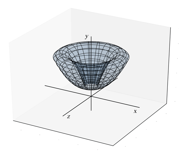 révolution obtenu en faisant tourner autour de l'axe $y$ la région délimitée par la parabole $y=$ $-4x^2$ $+24x$ $-32$ et l'axe des $x$.