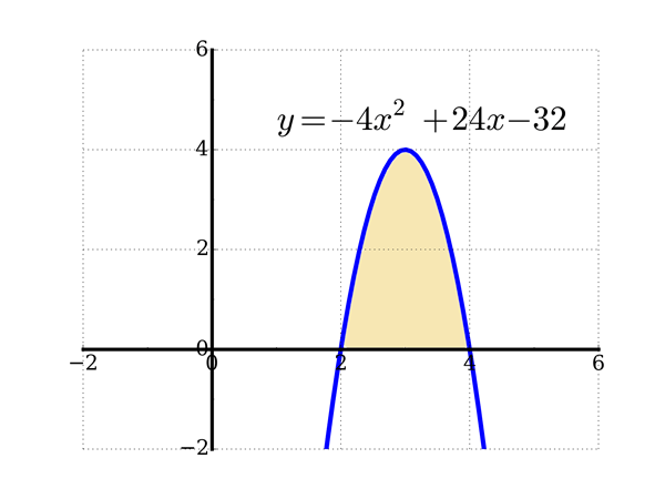 Solution : Dans ce cas-ci, on a $f(x)$ $=$ $-4x^2$ $+$ $24x-32$ et $g(x)=0$. On constate dans la figure à droite que la parabole intersecte l'axe des $x$ en $x=2$ et $x=4$ La formule donne donc