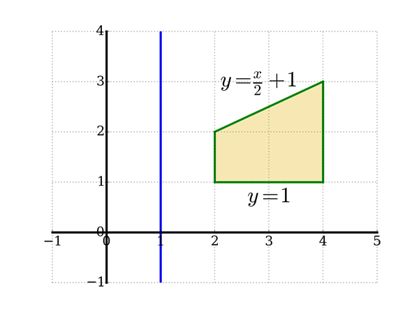 Problème 2. Calculer le volume du solide de révolution obtenu en faisant tourner le trapèze de sommets $(2, 1)$, $(4, 1)$, $(4, 3)$ et $(2, 2)$ autour de la droite $x = 1$.